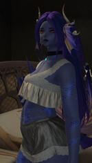 A creation of Vardavar Underwater Research Station, a sprawling Allagan facility deep beneath the Sirensong Sea. She is a prototype 4th generation Allagan chimera created utilizing genetic and aetheric material primarily from a pair of sirens and a Sahagin matriarch. Deemed a failure and being preserved for later study, Zana was placed in a stasis pod in the laboratory’s Chimeric Research Facilities and, due to the facility’s lockdown when it failed to control the pseudo-Eikon Vahakn and the advent of the Fourth Umbral calamity, she was destined to remain there for the next five millennia. At the end of the Silverwings’ expedition into Vardavar, Djaal accidentally opened the pod mistaking it for a door, and the credentials he used were transferred to her neurolink, making her believe she was required to serve him as “Lord Justicar.”With only the base knowledge programmed into her by her Allagan Neurolink, Zana has a naive, almost childish outlook on the world and is always eager to experience more of it. Her siren traits give her voice strange, mind-bending abilities which she will often use playfully if she isn’t being restrained by her mask.While only ever given a serial number in Vardavar, Djaal named her “Zana” after an old myth in his tribe about a sea witch, and the facility became her surname. In spite of the effort he went through naming her, Djaal seldom refers to Zana as anything besides “Sushi” and the crew typically just calls her “the fish.”
